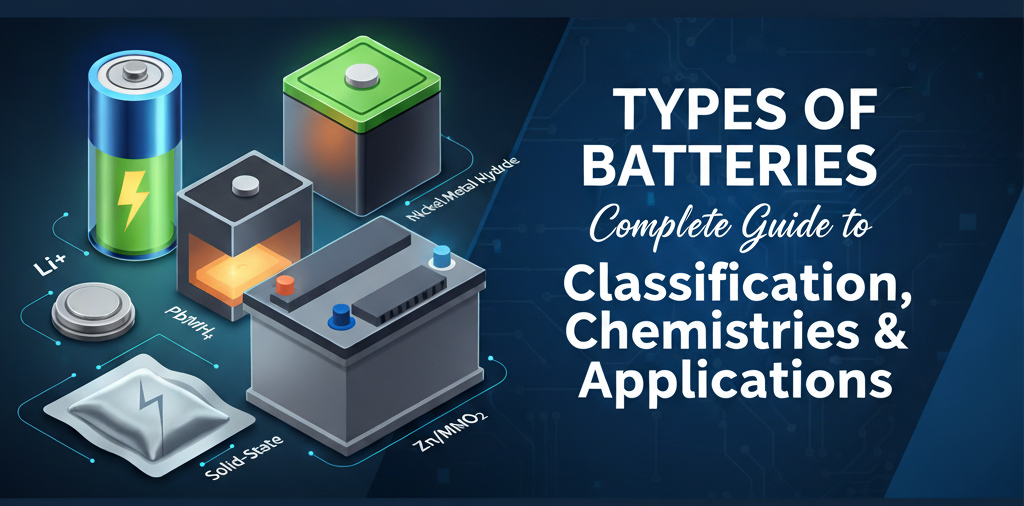 Types of Batteries: Classification, Chemistries, Applications & Future Trends (बैटरियों के प्रकार: वर्गीकरण, रसायन, अनुप्रयोग और भविष्य की दिशा)
